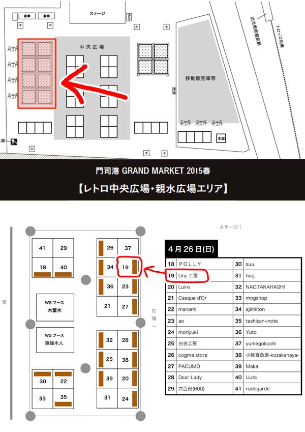 2015年04月20日 門司港グランマーケットでのブースの場所が決まりました カテゴリ:イベント 『minneマルシェ in 門司港グランマーケット』2015年4月26日(日) 10時から16時まで門司港レトロ中央広場 minneブース(左側テント)「19番」Uriji工房お待ちしております! タグ :#門司港グランマーケット 「イベント」カテゴリの最新記事 minne(ミンネ)「注目の作品をピックアップ」に選ばれましたminne(ミンネ)母の日のおくりもの特集「とびきり素敵なファッションアイテムを選ぶ」に選ばれました