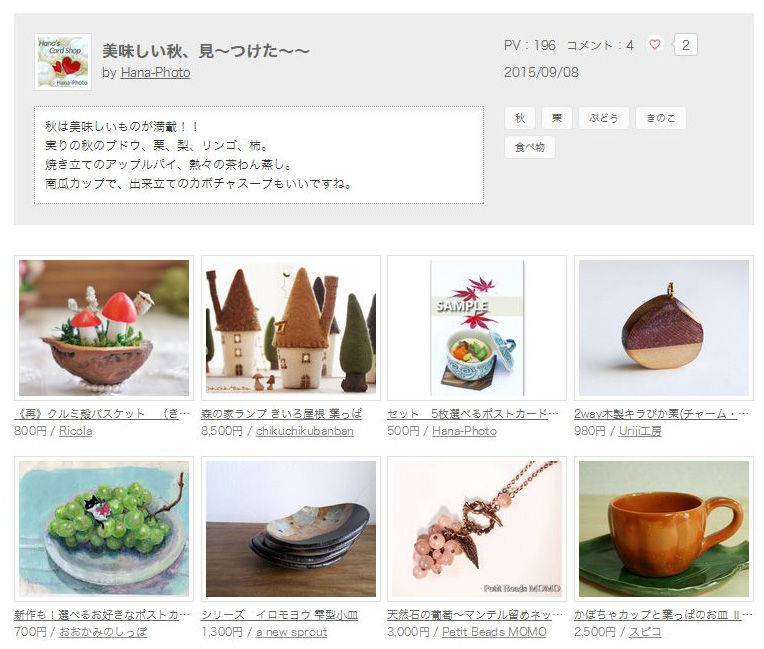 2015年09月09日 Creema(クリーマ)キュレーション「美味しい秋、見~つけた~~」に「2way木製キラぴか栗」を紹介して頂きました。 カテゴリ:Creema(クリーマ) 美味しい秋、見~つけた~~ by Hana-Photo さんhttp://www.creema.jp/curations/detail/id/51482way木製キラぴか栗(チャーム・ストラップ)http://www.creema.jp/exhibits/show/id/628659 タグ :#食べ物#バッグチャーム#ストラップ 「Creema(クリーマ)」カテゴリの最新記事 Creema(クリーマ)キュレーション「秋の夜長に」に「しおりぐり キラピカ」を紹介して頂きました。ハンズギャラリーマーケットの「秋の収穫特集」に「しおりぐり 」と「木製サツマイモしおり」を紹介して頂きました。
