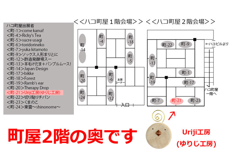 2015年11月27日 ハコイチ(箱崎手づくり市)12月の出展場所が決まりました カテゴリ:イベント ハコイチ(箱崎手づくり市)http://hanatoya.jp/tedukuri/index.html2015年12月20日(日)10時~16時出展場所:ハコ町屋<町-21>http://hanatoya.jp/tedukuri/list57.html〒812-0053 福岡市東区箱崎2丁目10-34http://hanatoya.jp/tedukuri/info.htmlハコ町屋の2階の奥になります。どうぞよろしくお願いいたします。 タグ :#ハコイチ 「イベント」カテゴリの最新記事 「OSAKAアート&てづくりバザールvol.20 minneブース」の場所が決まりました木のしおりどり(ブックマーカー)