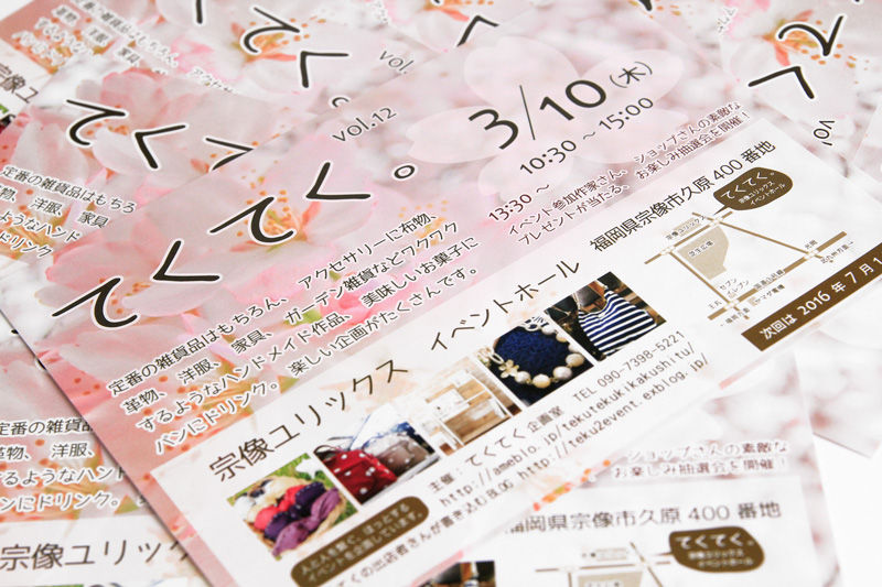 2016年03月08日 「宗像 てくてく。vol.12」のUriji工房の場所です カテゴリ:イベント てくてく。vol.122016年3月10日(木)10:30-15:00宗像ユリックス イベントホール福岡県宗像市久原400番地3月10日「てくてく。vol12」レイアウト発表!!http://ameblo.jp/tekutekukikakushitu/entry-12133506715.htmlてくてく企画室http://ameblo.jp/tekutekukikakushitu/「てくてく。」作品紹介http://teku2event.exblog.jp/どうぞよろしくお願いします。 タグ :#てくてく。 「イベント」カテゴリの最新記事 minne本日のおすすめ「facebook」「Twitter」で「木製帯留め 市松寄木 小鳥」を紹介して頂きました「久留米ハンドメイドフェスタ5」に出展しました