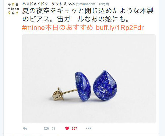2016年05月26日 minne「Twitter」で「木製 星空ティアドロップピアス」を紹介して頂きました カテゴリ:minne(ミンネ) 木製 星空ティアドロップピアスhttps://minne.com/items/4264705 タグ :#ピアス 「minne(ミンネ)」カテゴリの最新記事 Creema(クリーマ)キュレーションに「木製 夜光るピアス ブルー S」を紹介して頂きました。Creema(クリーマ)キュレーションに「木製カメラのペンダント」を紹介して頂きました。
