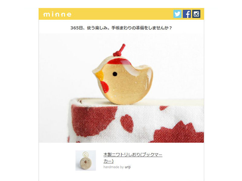 2016年11月19日 minne(ミンネ)メールに「 木製ニワトリしおり」を紹介して頂きました カテゴリ:minne(ミンネ) 木製ニワトリしおり(ブックマーカー)https://minne.com/items/7015738 タグ :#しおり 「minne(ミンネ)」カテゴリの最新記事 第18回手づくり市場 in 北九州 HAND MADE MARCHE 2016 の出展場所ですminne(mag)セレクション「お正月を何倍も楽しくする「酉(とり)」グッズ」に「 木製ニワトリしおり」を紹介して頂きました