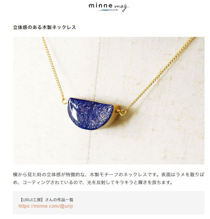2017年05月28日 minne(mag)「身近に神秘的な輝きを-宇宙・星座モチーフ」に「木製 半月ネックレス 星空」を紹介して頂きました カテゴリ:minne(ミンネ) 「身近に神秘的な輝きを-宇宙・星座モチーフ」https://mag.minne.com/2017/05/26/selection_space/「宇宙のひみつ」https://minne.com/curations/340「木製 半月ネックレス 星空」https://minne.com/items/8834515 「minne(ミンネ)」カテゴリの最新記事 minne(ミンネ)特集「宇宙のひみつ」に「木製 半月ネックレス 星空」を紹介して頂きました工房改装:カウンターを作りました
