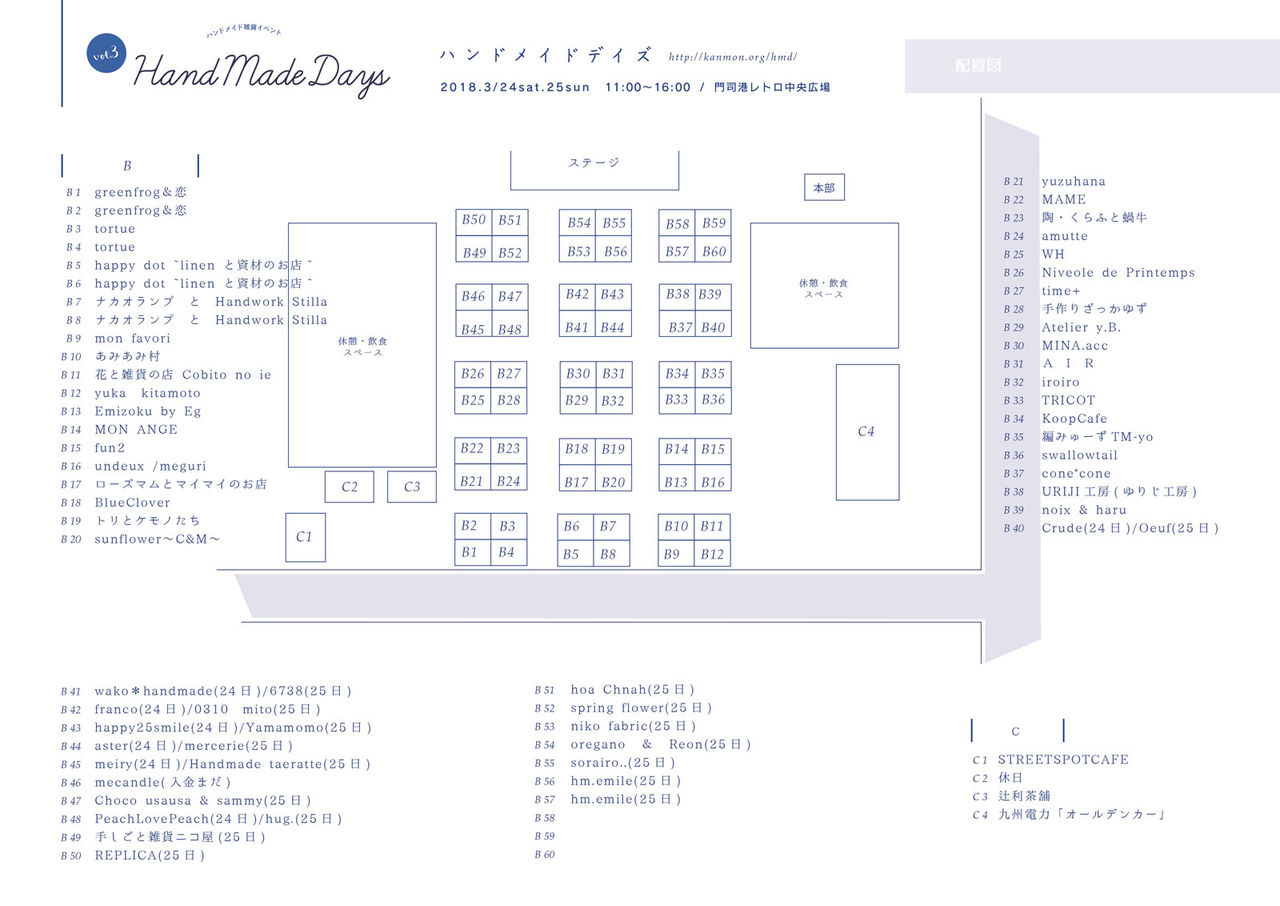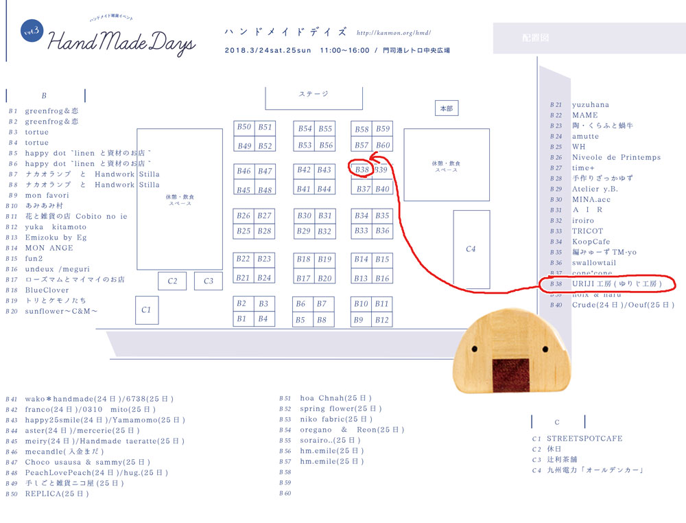 2018年03月19日 「ハンドメイドデイズ3」のURIJI工房(ゆりじ工房)の出展場所です カテゴリ:イベント ハンドメイドデイズ3 門司港レトロ2018年3月24日(土)~25日(日)11時~16時門司港レトロ中央広場・親水広場出展場所:B38http://kanmon.org/hmd/ 「イベント」カテゴリの最新記事 minne「Twitter」で「寄木のいちごチョコケーキしおり(ブックマーカー)」を紹介して頂きました「ハコイチ(箱崎手づくり市)」4月のURIJI工房(ゆりじ工房)の出展場所です