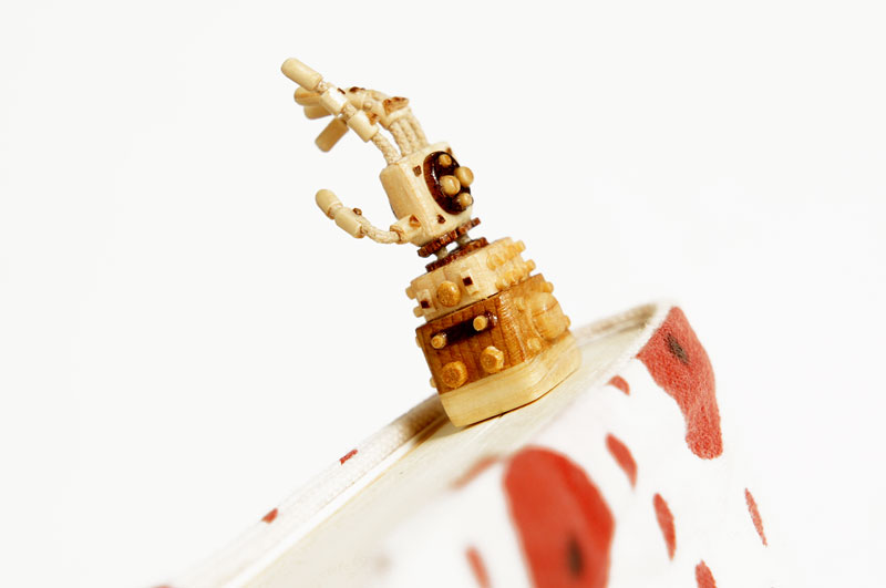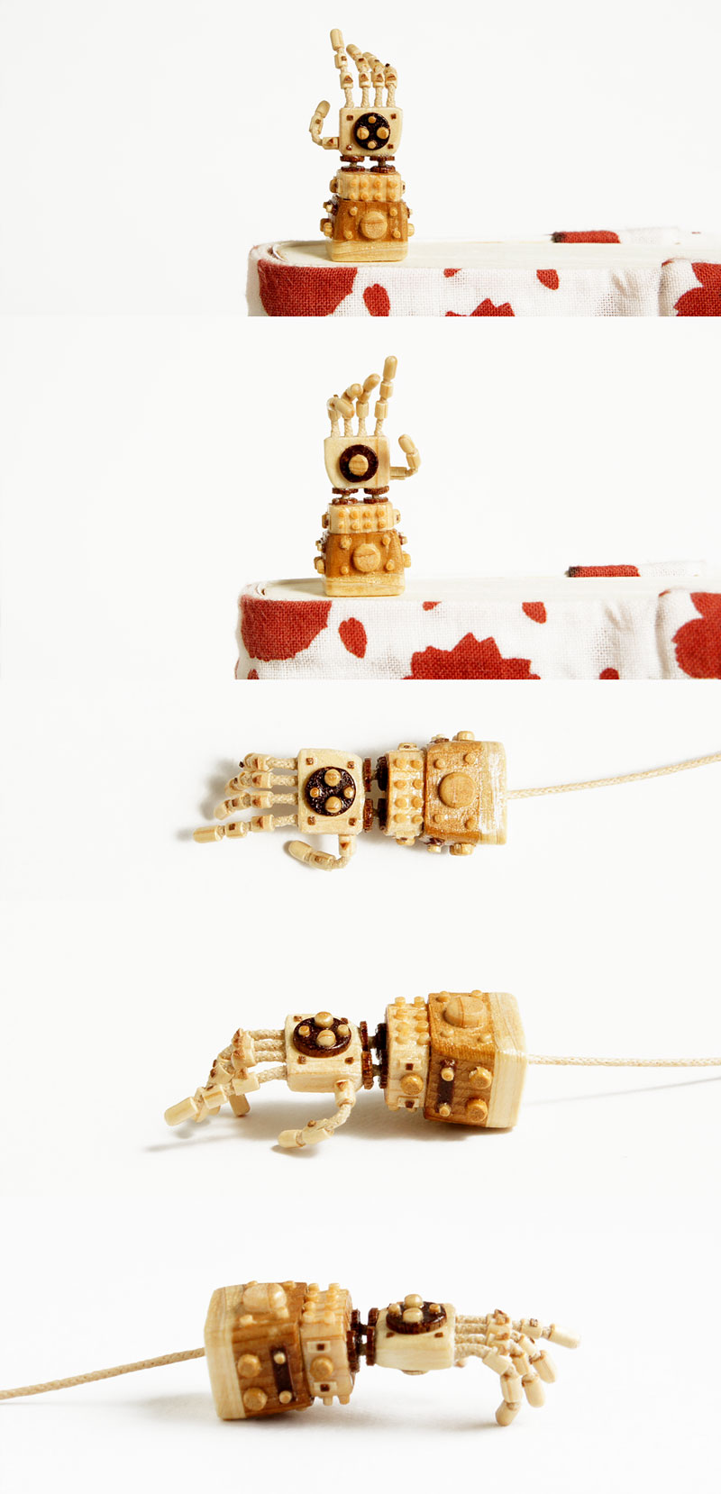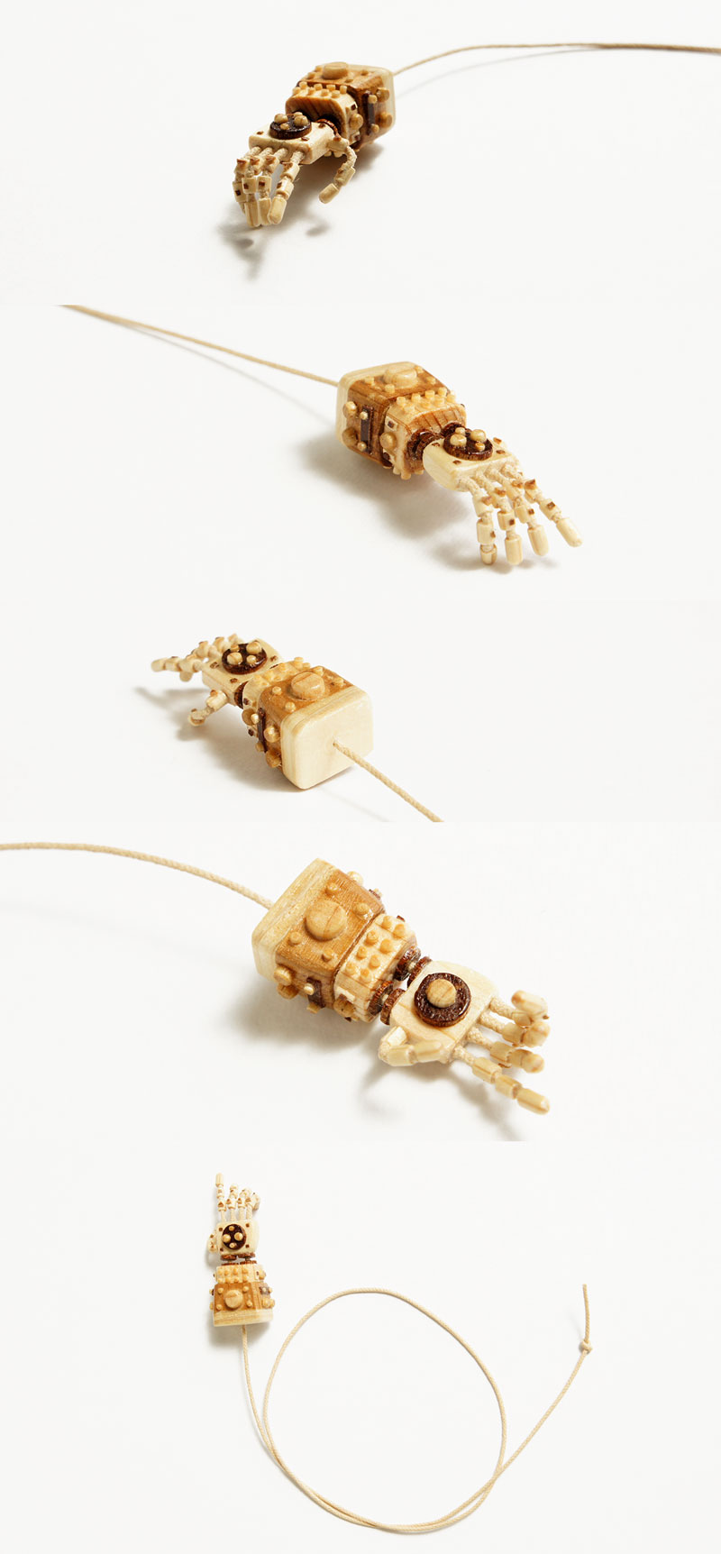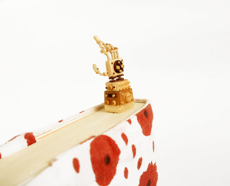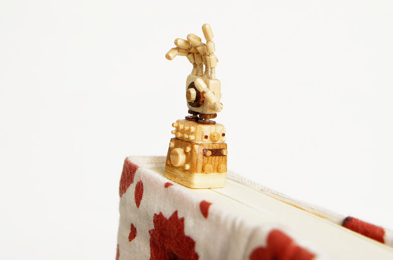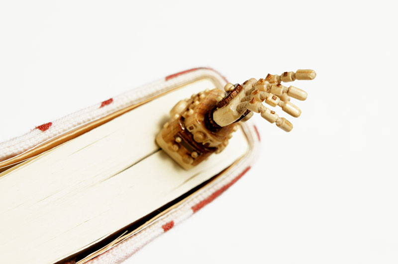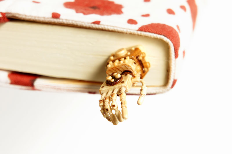 木製のロボットの手が本から飛び出しているブックマーカーです。