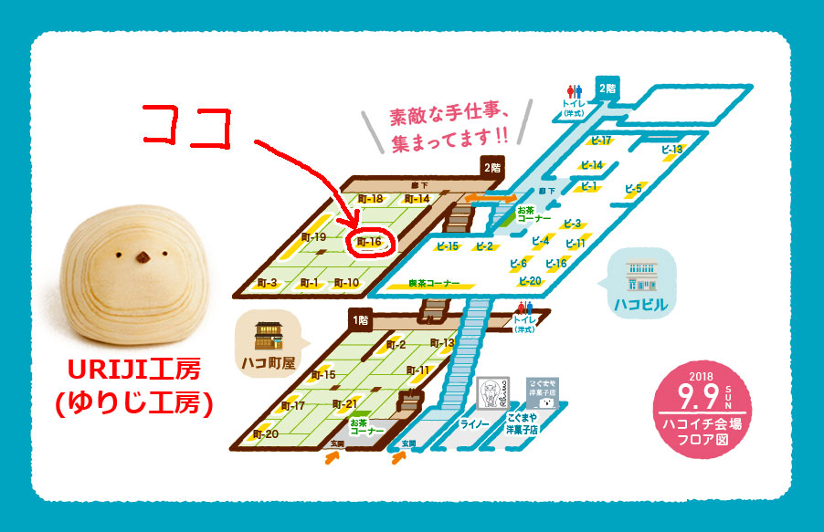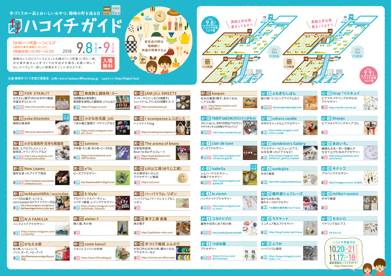 2018年09月07日 「ハコイチ(箱崎手づくり市)」9月のURIJI工房(ゆりじ工房)の出展場所です カテゴリ:イベント ハコイチ(箱崎手づくり市)http://hako1.fun2018年9月9日(日)10時~16時出展場所:ハコ町屋 <<町-16>>http://hako1.fun/2018/08/15/list87/〒812-0053 福岡市東区箱崎2丁目10-34http://hanatoya.jp/tedukuri/info.htmlhttp://hako1.fun/rental/ ハコ町屋の2階です。どうぞよろしくお願いします。 「イベント」カテゴリの最新記事 9月のURIJI工房の営業日です「太陽と海のマルシェin門司港」のURIJI工房(ゆりじ工房)の出展場所です