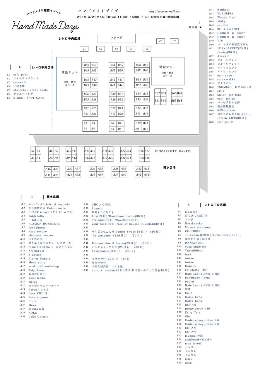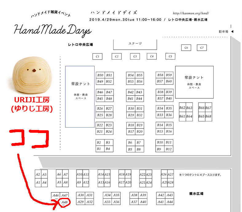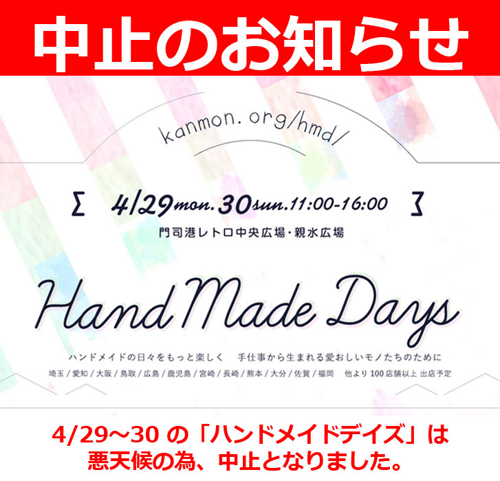 2019年04月20日 「ハンドメイドデイズ」中止のお知らせ カテゴリ:イベント 雨と風に伴う荒天予報のため、今回は2日間とも中止となりました。※ 30日のみ出展します「ハンドメイドデイズ」福岡県北九州市門司港レトロ2019年4月29日(祝・月)、30日(祝・火)11:00ー16:00※雨天決行(荒天の場合は中止)レトロ中央広場・親水広場・ハーバーデッキ出店場所:A48 (30日のみ)http://kanmon.org/hmd/出店者一覧http://kanmon.org/hmd/exhibitors/雨と風に伴う荒天予報のため、今回は2日間とも中止となりました。※ 30日のみ出展します。 どうぞよろしくお願いします。 「イベント」カテゴリの最新記事 「糸島ハンドメイドカーニバル2019春」に出展します5月のURIJI工房の営業日です