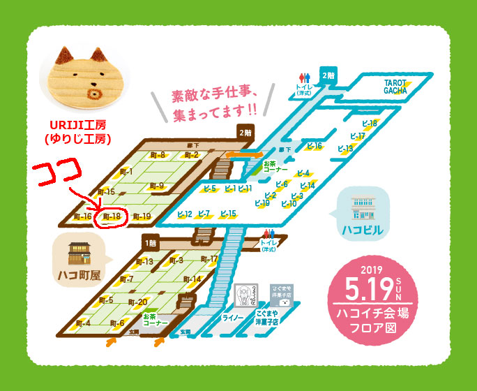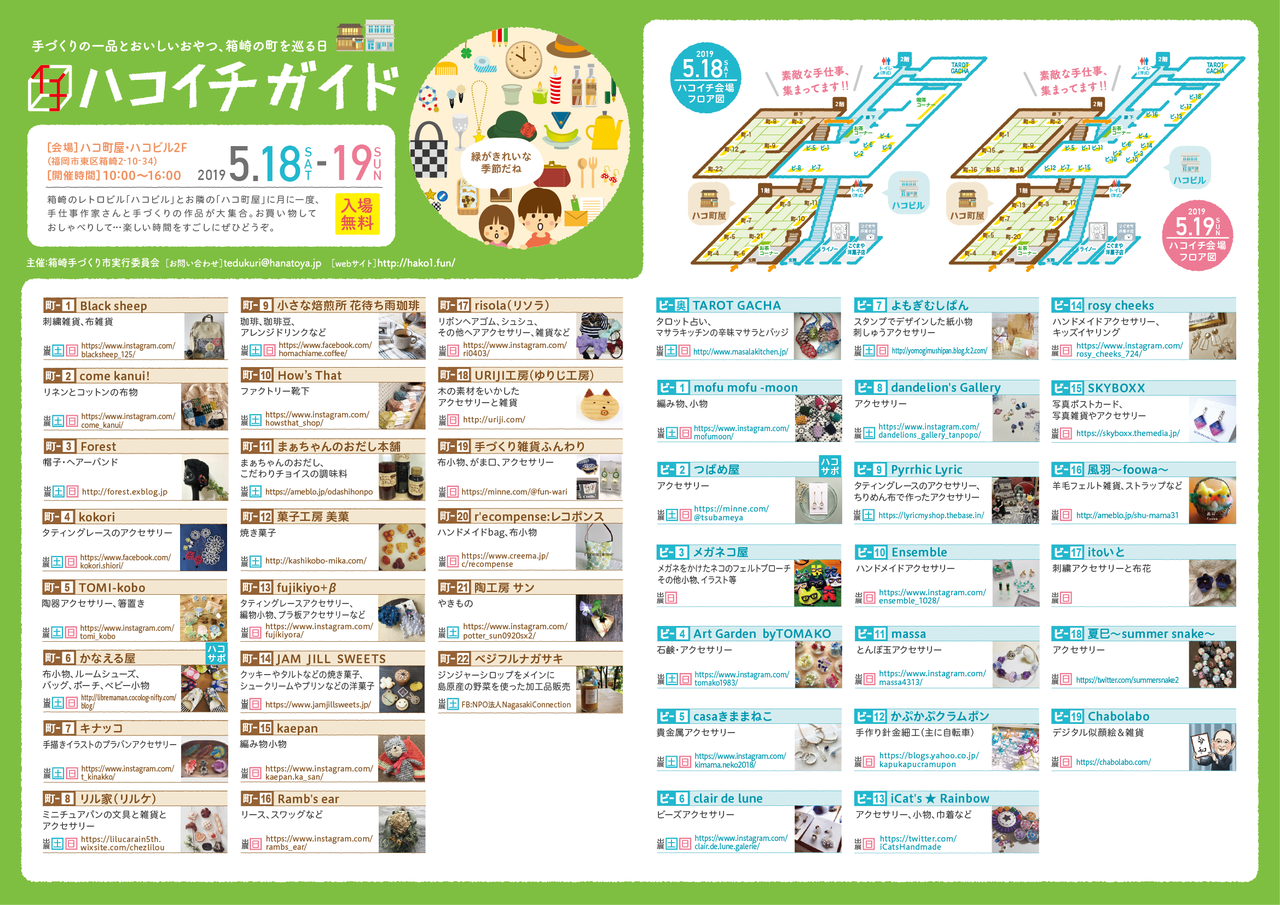 2019年05月17日 「ハコイチ(箱崎手づくり市)」5月のURIJI工房(ゆりじ工房)の出展場所です カテゴリ:イベント ハコイチ(箱崎手づくり市)http://hako1.fun2019年5月19日(日)10時~16時出展場所:ハコ町屋 <<町-18>>http://hako1.fun/2019/04/23/list95/〒812-0053 福岡市東区箱崎2丁目10-34http://hanatoya.jp/tedukuri/info.htmlhttp://hako1.fun/rental/ ハコ町屋の2階です。どうぞよろしくお願いします。 「イベント」カテゴリの最新記事 minne特集「天然素材のアクセサリー」に「木製ハートチョコブローチ」を紹介して頂きました木製二眼レフカメラボックス