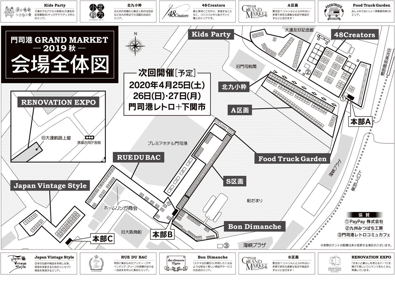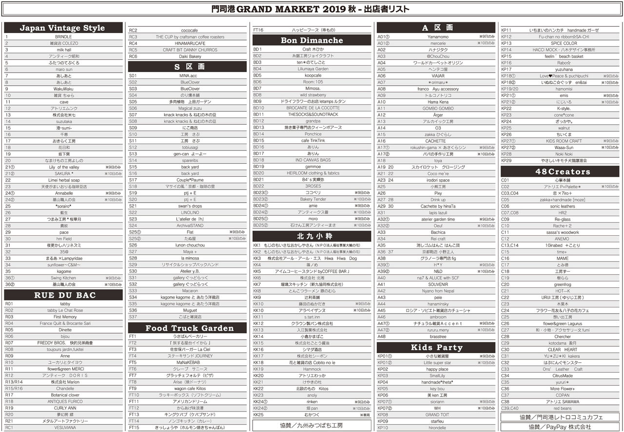 2019年11月06日 「門司港グランマーケット2019秋」 の出展場所です カテゴリ:イベント 「門司港グランマーケット2019秋」日時:2019年11月9日(土)10:00~16:00 2019年11月10日(日)10:00~16:00会場:福岡県北九州市門司区 門司港レトロ地区一帯出展場所:門司港レトロ中央広場 【48Creators】 C-22 ※ステージの前の辺りです。 「イベント」カテゴリの最新記事 『ユトリエ』の「ちいさいもの展」に出展いたします「モノヅクリサローネ」の出展場所です