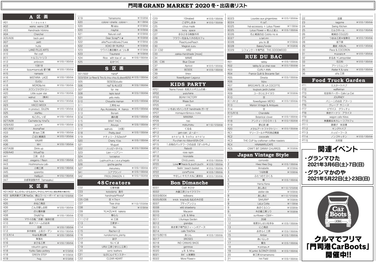 2020年12月02日 「門司港グランマーケット 2020 冬」 の出展場所です カテゴリ:イベント 「門司港GRANDMARKET 2020 冬」門司港グランマーケット 2020 冬2020年12月11日(金)12日(土)13日(日)10:00~16:00会場:福岡県北九州市門司区 門司港レトロ地区一帯出展場所:門司港レトロ中央広場 48Creators C-19 ※ステージの前の辺りです。 「イベント」カテゴリの最新記事 博多阪急『ユトリエ』ちいさいもの展 2020 に出展いたします小倉井筒屋『きたきゅうフェスティバル』に出展いたします