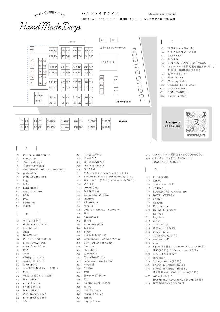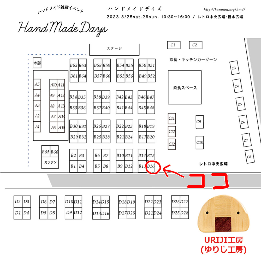 2023年03月20日 「ハンドメイドデイズ門司港」に出展いたします カテゴリ:イベント 「ハンドメイドデイズ」福岡県北九州市門司港レトロ2023年3月25日(土)・26日(日)時間:10:30〜16:00※雨天決行(荒天の場合は中止)レトロ中央広場・親水広場出展場所:B-16http://kanmon.org/hmd/出店者紹介(Instagram)https://www.instagram.com/handmade_days/ 「イベント」カテゴリの最新記事 「ふくおかハンドメイド&雑貨フェスタ 2023」に出展いたします「博多おさんぽマルシェ」に出展いたします