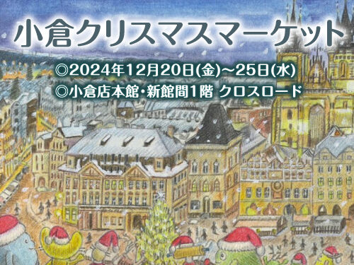 2024年12月19日 「小倉クリスマスマーケット(井筒屋クロスロード)」に出展いたします カテゴリ:イベント 小倉クリスマスマーケット(井筒屋)2024年12月24日(火)のみ10:00~20:00小倉店本館・新館の間1階 クロスロード小倉井筒屋 公式サイトhttps://www.izutsuya.co.jp/storelist/archives/70272150.html?shop=kokura 「イベント」カテゴリの最新記事 「広島ハンドメイドフェスティバル2024」に出展いたしますminne特集「猫に一目惚れ」に「ちいさな木彫りネコ 置物 F」を紹介して頂きました。